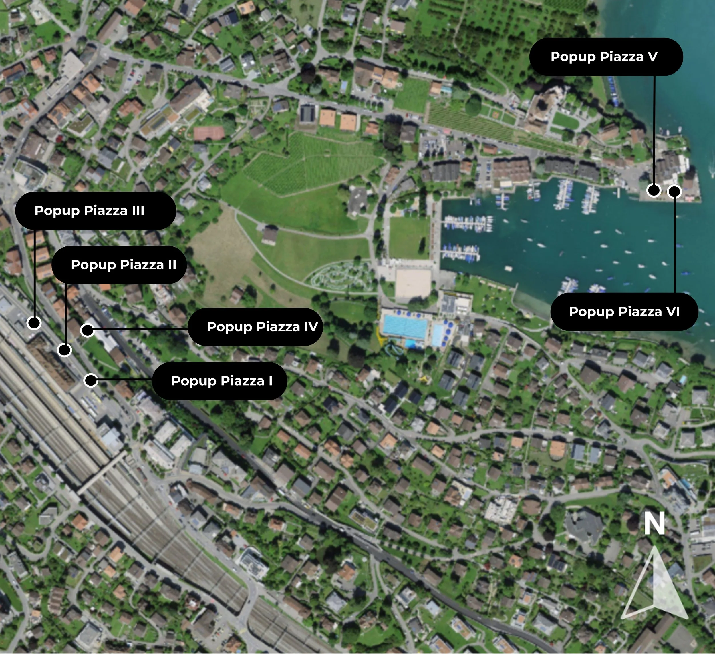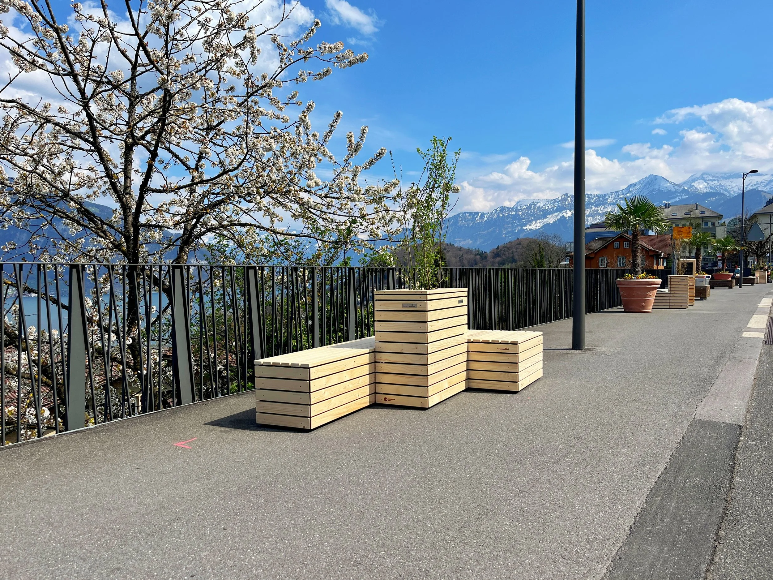 Drei öffentliche Räume in Spiez werden mit modularen PopUp Piazzas aufgewertet und in einladende Begegnungsorte verwandelt. Zum Einsatz kommen mobile Holzelemente mit integrierten Sitzgelegenheiten, punktuell ergänzt durch Begrünung und ein Sonnensegel für natürlichen Schatten und mehr Atmosphäre. Die temporäre Installation fügt sich harmonisch in den bestehenden Stadtraum ein und lässt sich bei Bedarf vollständig rückstandslos zurück bauen.