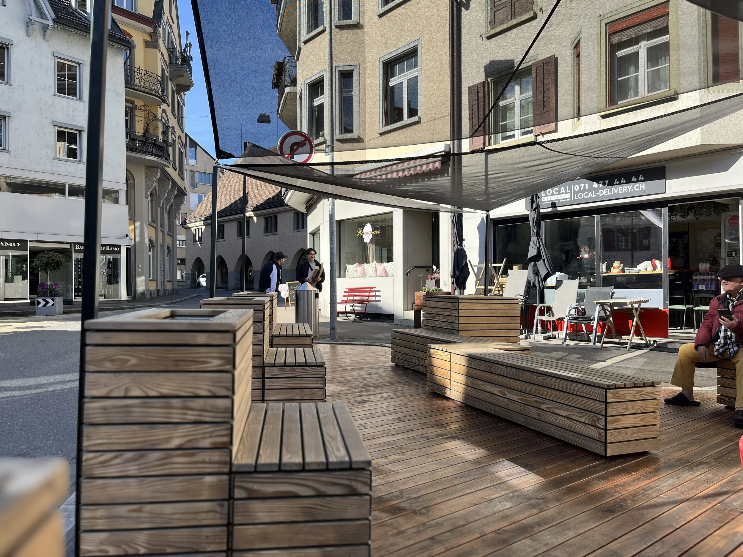 Die Massnahme generiert neue Aufenthaltsqualitäten und wird als niederschwelliger Beitrag zur Aktivierung des öffentlichen Raums wahrgenommen. Die Intervention unterstützt die Leitlinien der UNICEF-Initiative „Kinderfreundliche Gemeinde“ und liefert wichtige Erkenntnisse für die zukünftige, dauerhafte Umgestaltung des Marktplatzes. Nachträglich wurde die Installation zudem mit einer grossflächigen Sonnensegel-Landschaft ergänzt, welche zusätzlichen Schatten und Aufenthaltskomfort schafft.