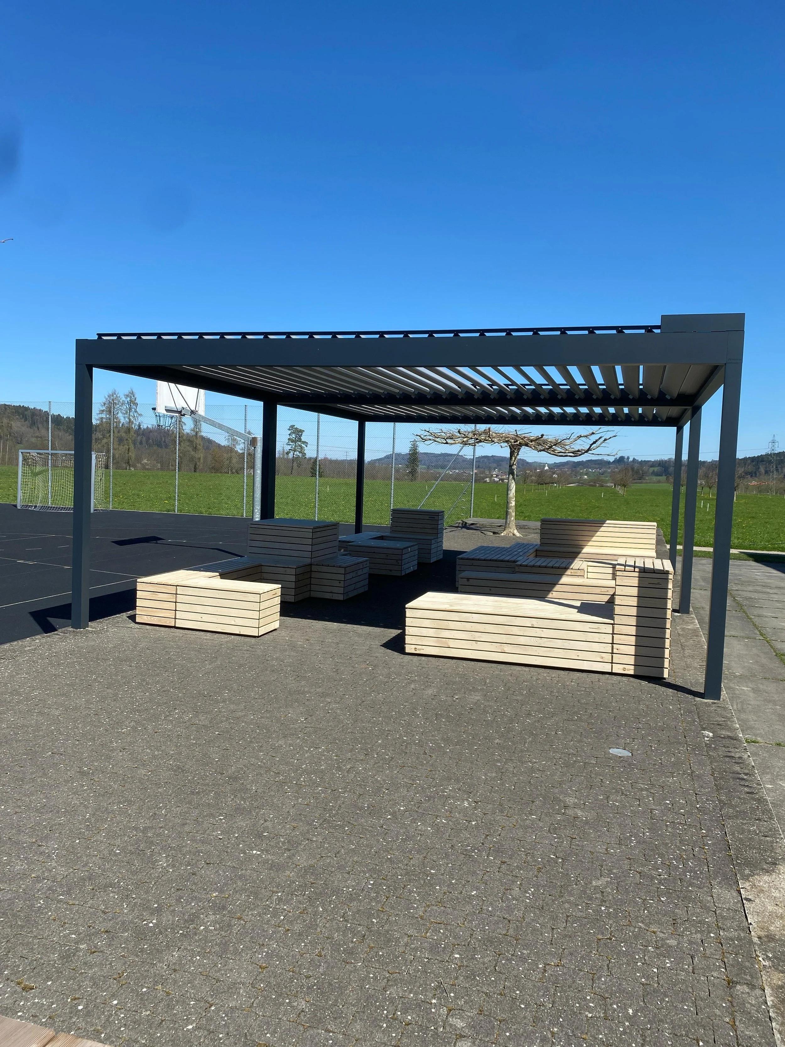 Auf dem erhöhten Teil des Pausenplatzes des OZ Thurzelg wurde zwischen den Bäumen eine fixe Pergola installiert, welche mit verstellbaren Lamellen bei Bedarf Schatten spendet und vor Regen schützt. Diese Aufenthalts-Zone wurde zusätzlich mit modularen Sitz-Elementen möbliert.